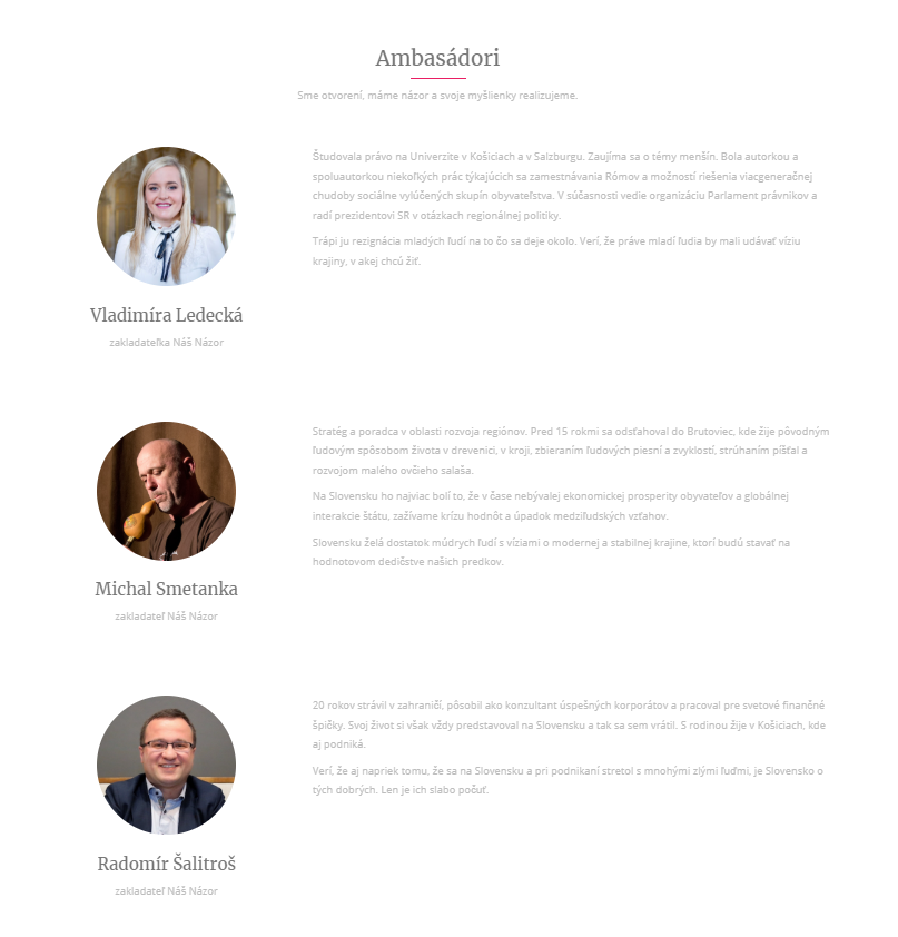 V archíve webovej stránky projektu Náš Názor sú zverejnené fotografie, na ktorých sú Vladimíra Ledecká, Radomír Šalitroš a Michal Smetanka prezentovaní ako zakladatelia projektu. Okrem toho, v tlačovej správe z obdobia založenia platformy sa uvádza: „Za týmto projektom sú traja kamoši (Vladimíra Ledecká, Rado Šalitroš a Michal Smetanka), ktorí tiež hundrali pri pive a pred telkou, až kým si nepovedali, že to skúsia inak.“