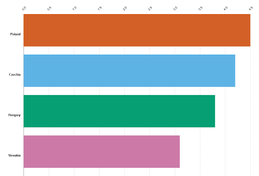 Hodnota potravinovej inflácie spolu s nealkoholickými nápojmi bola vo zvyšných troch krajinách V4 vyššia. Konkrétne v Maďarsku dosiahla 3,8 %, v Česku 4,2 % a Poľsku 4,5 %. Slovensko sa tiež nachádzalo tesne pod priemerom EÚ v oblasti potravinovej inflácie. Dáta Eurostatu sú k decembru 2025.