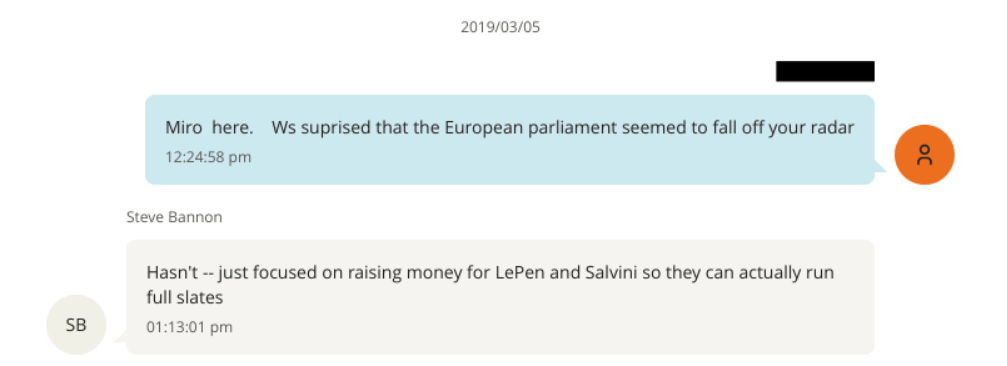 Odtajnené Epsteinove spisy ukazujú, že Bannon sa snažil získať peniaze pre posilnenie európskych krajne pravicových strán vrátane francúzskej političky Marine Le Pen či talianskeho politika Mattea Salviniho (.pdf, s. 4). Epsteinovi o týchto zámeroch písal napríklad v marci 2019.