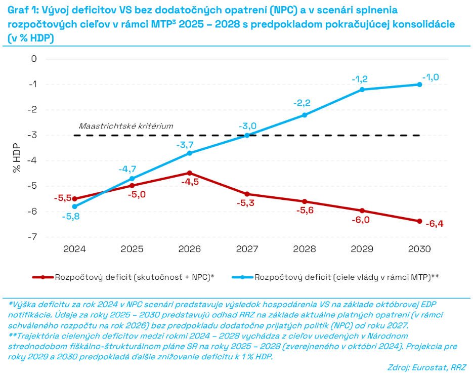 Ani po troch kolách konsolidačných opatrení, ktorých cieľom bolo postupné znižovanie deficitu a stabilizácia verejného dlhu, sa podľa RRZ zatiaľ nepodarilo dosiahnuť očakávané zlepšenie stavu verejných financií. V roku 2024 sa hospodárenie dokonca zhoršilo, keď deficit stúpol z 5,2 % HDP v roku 2023 na 5,5 % HDP v roku 2024. V roku 2025 sa podľa odhadov RRZ deficit znížil na 5 % HDP a v roku 2026 sa zníži na 4,5 % HDP. Tieto odhady pritom už zohľadňujú prijaté konsolidačné balíčky. V roku 2027 sa podľa RRZ deficit zvýši na 5,3 % HDP za predpokladu, že vláda neprijme ďalšie konsolidačné opatrenia.