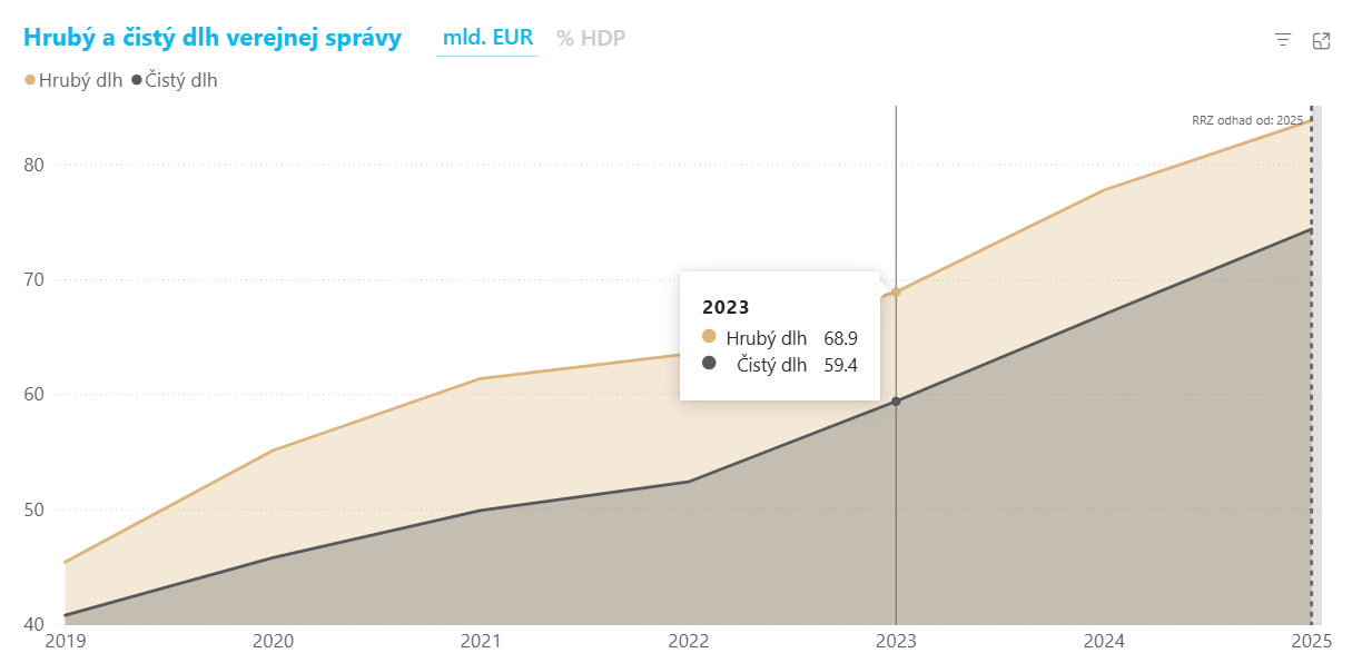 Slovenská republika mala ku koncu roka 2023 dlh verejnej správy 68,83 miliardy eur, čo predstavovalo 56 % HDP. Ladislav Kamenický bol vymenovaný za ministra financií v októbri 2023. V roku 2024 dlh verejnej správy dosiahol 77,7 miliardy eur. Oficiálne čísla za rok 2025 ešte neboli zverejnené, podľa odhadu RRZ však hrubý dlh Slovenskej republiky dosiahne 83,8 miliardy eur. Podľa tohto odhadu sa tak od konca roka 2023 zvýšil hrubý dlh Slovenska o 15 miliárd eur.